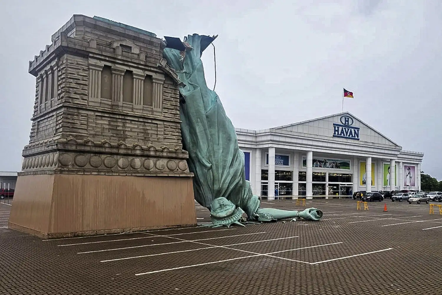 The towering replica—installed above a parking lot at Brazilian retailer Havan in Guaíba, in Rio Grande do Sul—fell from its pedestal around 3 p.m. local time, according to StringersHub and Newsweek.