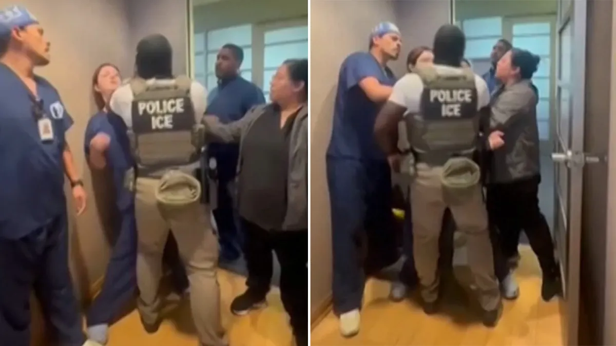 The incident occurred Tuesday, July 8, at the Ontario Advanced Surgery Center, roughly 30 miles east of Los Angeles. In the video, a staff member in blue scrubs can be heard shouting at agents: “Get your hands off of him… Let him go. You need to get out,” as she shields the man from arrest.