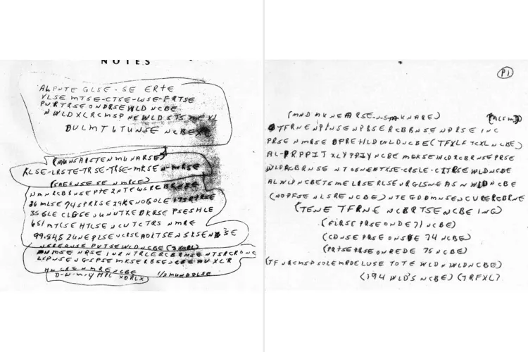 The notes—around 30 rows of capital letters, numbers, dashes, and parentheses divided into sections—stumped investigators. They were handed over to the FBI’s Cryptanalysis and Racketeering Records Unit (CRRU), the same team that once cracked coded messages used by Nazi spies.