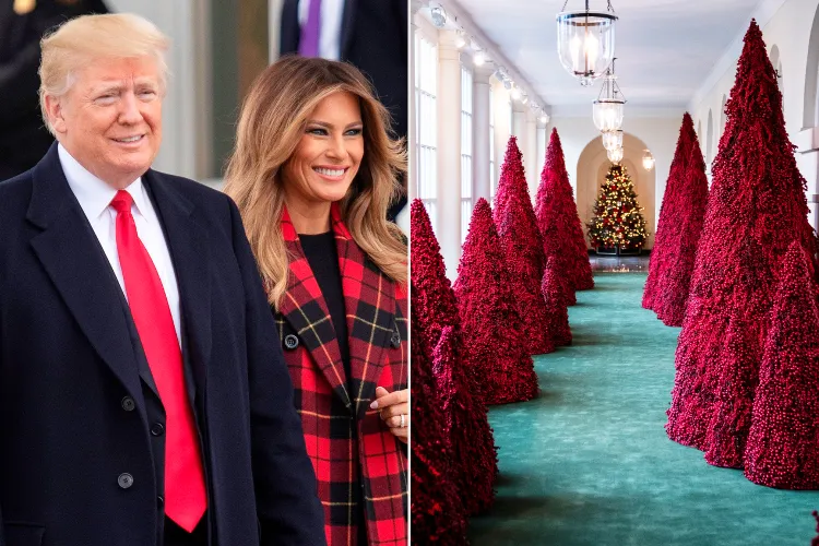 During her first White House Christmas in 2017, she lined the East Colonnade with tall bundles of white-painted sticks, creating a stark, wintry corridor. The following year, she leaned even further into an unconventional look with shaggy trees in a deep red hue — a choice that drew especially sharp commentary, including The New York Times article titled “There Will Be Blood-Red Trees,” and The Cut’s tribute, “Melania’s Christmases, Ranked from Most to Least Haunted.”