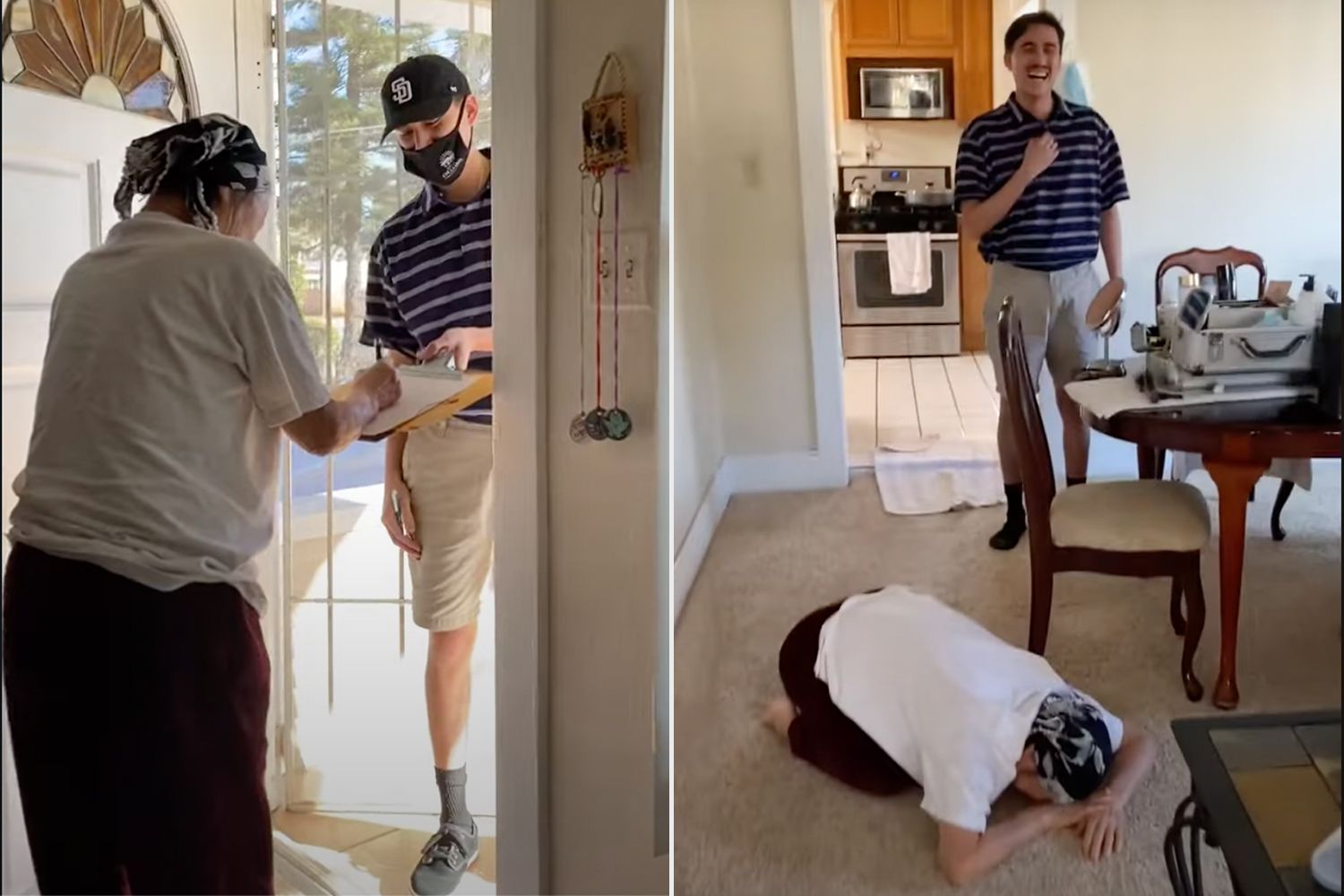What was meant to be a brief joke quickly took an unexpected turn when their grandma invited the “delivery man” to use her bathroom. She even offered him food, handing over a Tupperware of chicken noodle soup with utensils. When Anthony asked if he could eat it there, she didn’t hesitate, pulling out a chair at the dining table.