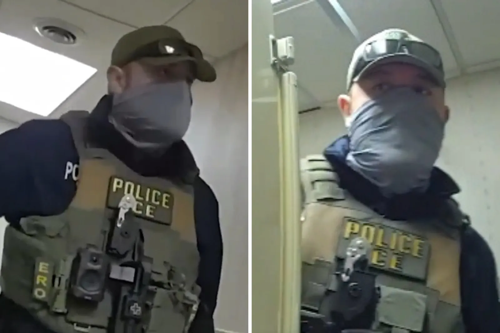 At one point, agents tried to open a locked women’s restroom door. When it did not open, the footage shows them forcing entry and issuing the directive to the person inside.