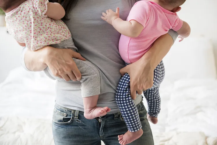 Stock image of woman holding twins. Credit : JGI/Jamie Grill/Getty