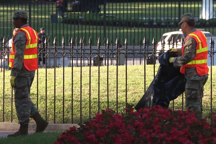 On Tuesday, Aug. 26, Fox 5 DC’s Allison Papson posted a video showing service members in reflective orange vests over their camouflage uniforms slowly moving through Lafayette Park, stopping occasionally to collect garbage.