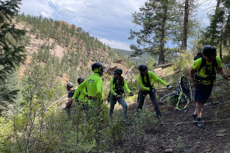 Emergency crews carried out a technical rope recovery operation with help from Conifer Fire, the Alpine Rescue Team, and the Jefferson County Sheriff’s Office. Photos from the scene show rescue teams navigating the steep terrain with ropes and harnesses.