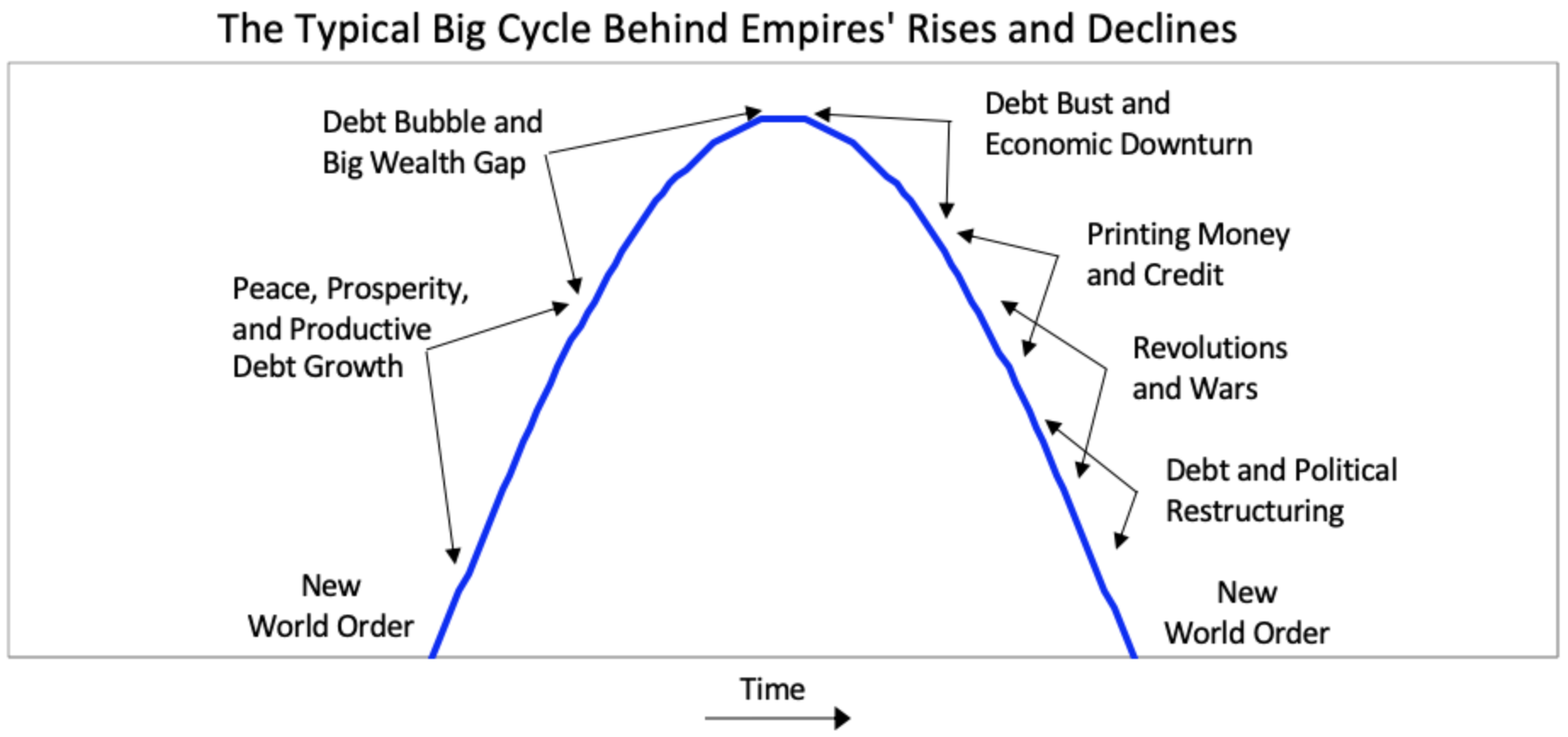 | Stage 5 | Large debts, wealth gaps, populism, and great power conflict. | CURRENT PHASE |