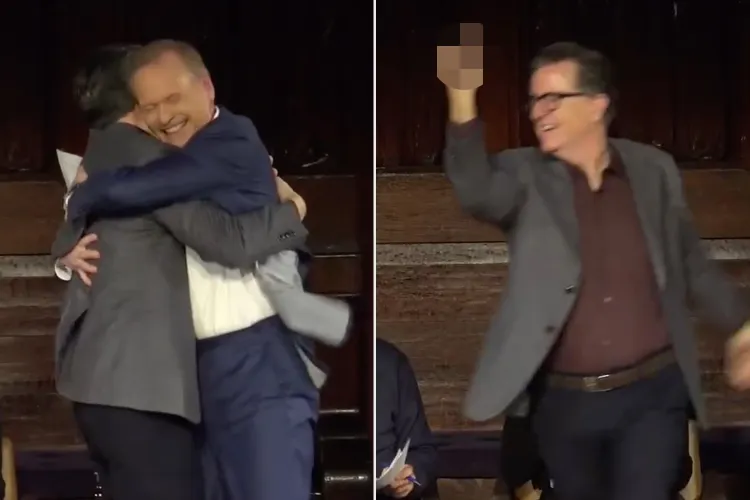 At Slate’s Political Gabfest event on Thursday, Dec. 18, host David Plotz welcomed a panel that included Dickerson and Colbert. As the applause swelled, Colbert, 61, stood up, crossed the stage, and hugged Dickerson. Then, turning toward the crowd, he raised his middle finger overhead — a gesture that seemed directed at CBS, the network that canceled The Late Show in July, drawing loud cheers from the audience.