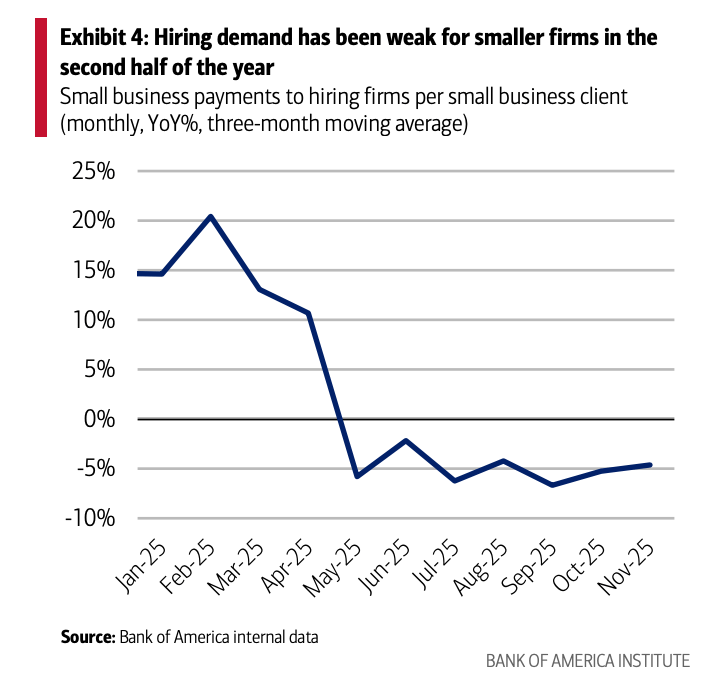 The strain is also showing up in hiring. Payments to hiring firms fell 4.6% year over year, reinforcing signs of a weakening jobs market among small businesses. BofA said that other research supports the same conclusion, pointing to the Institute’s November Employment Report and data from payroll provider ADP, both of which showed declines driven by losses at small firms. As the report notes, “With nearly half of the US workforce employed by such firms, this underscores the importance of the small business bedrock.”