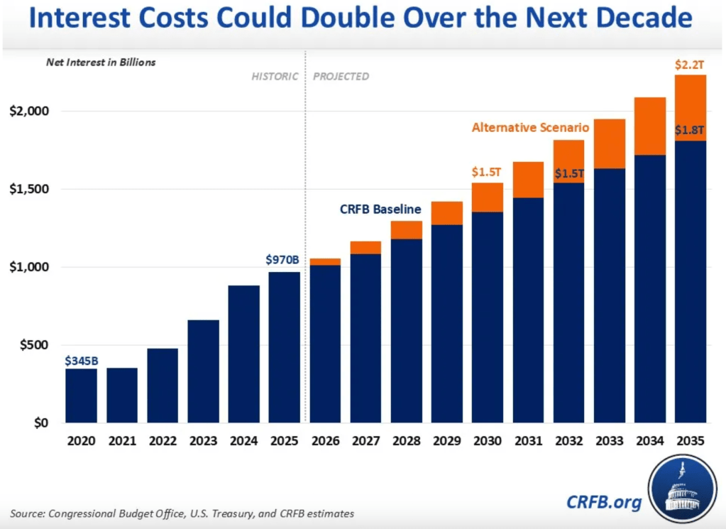 CRFB warns the numbers could get worse under certain policy scenarios. If the Supreme Court strikes down major parts of the Trump administration’s tariffs and provisions in the One Big Beautiful Bill Act are made permanent without offsets, CRFB estimates interest payments could exceed $2.0 trillion in 2034 and hit roughly $2.2 trillion in 2035. The group contrasted today’s reality with just five years ago: in FY 2020, net interest costs were $345 billion. Since then, they have roughly tripled, accelerated by pandemic-era emergency spending and higher borrowing needs—an increase CRFB suggests is becoming less a spike and more a lasting baseline.