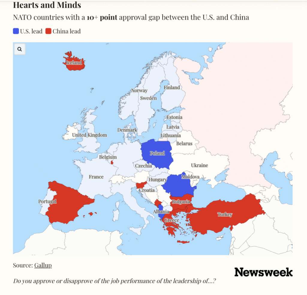Gallup survey: “Although the U.S. and China have similar median approval ratings across NATO, China has significantly higher ratings than the U.S. in eight member states, whereas the U.S. leads China in three.”