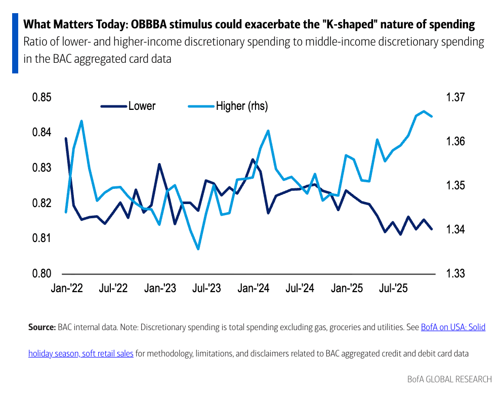 Middle- and higher-income earners are expected to be the primary beneficiaries of the new policy, according to senior U.S. economist Aditya Bhave, who warned that K-shaped spending dynamics could become even more pronounced. His assessment follows recent findings from the New York Federal Reserve showing that this economic divergence has been building for at least three years. “The consumer divide is about to get deeper,” Bhave said.