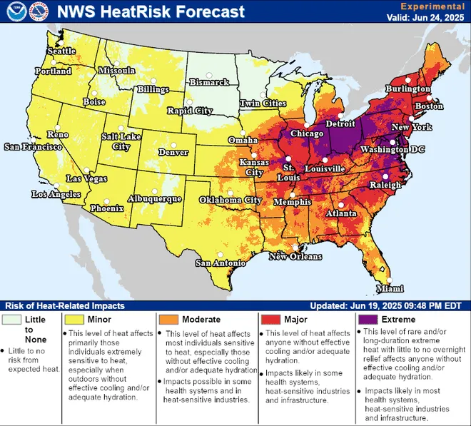 On June 20, more than 40 million Americans across the Midwest and Northeast were under extreme heat alerts. Temperatures in some areas could climb into the triple digits, especially when combined with high humidity. Cities like New York and Washington, D.C., may see temperatures above 90°F for several days straight.